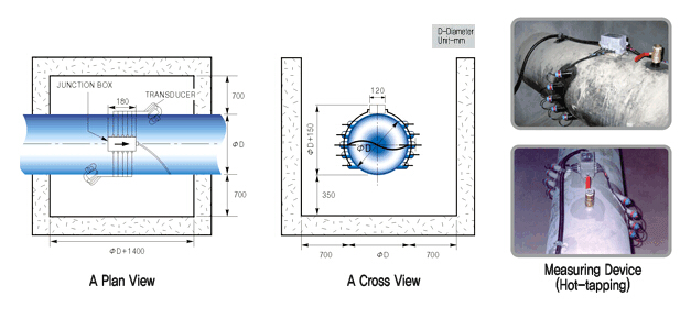 傳感器安裝示意圖(時(shí)差法)(當選用多普勒傳感器時(shí),每組傳感器安裝在管道同一切面上)